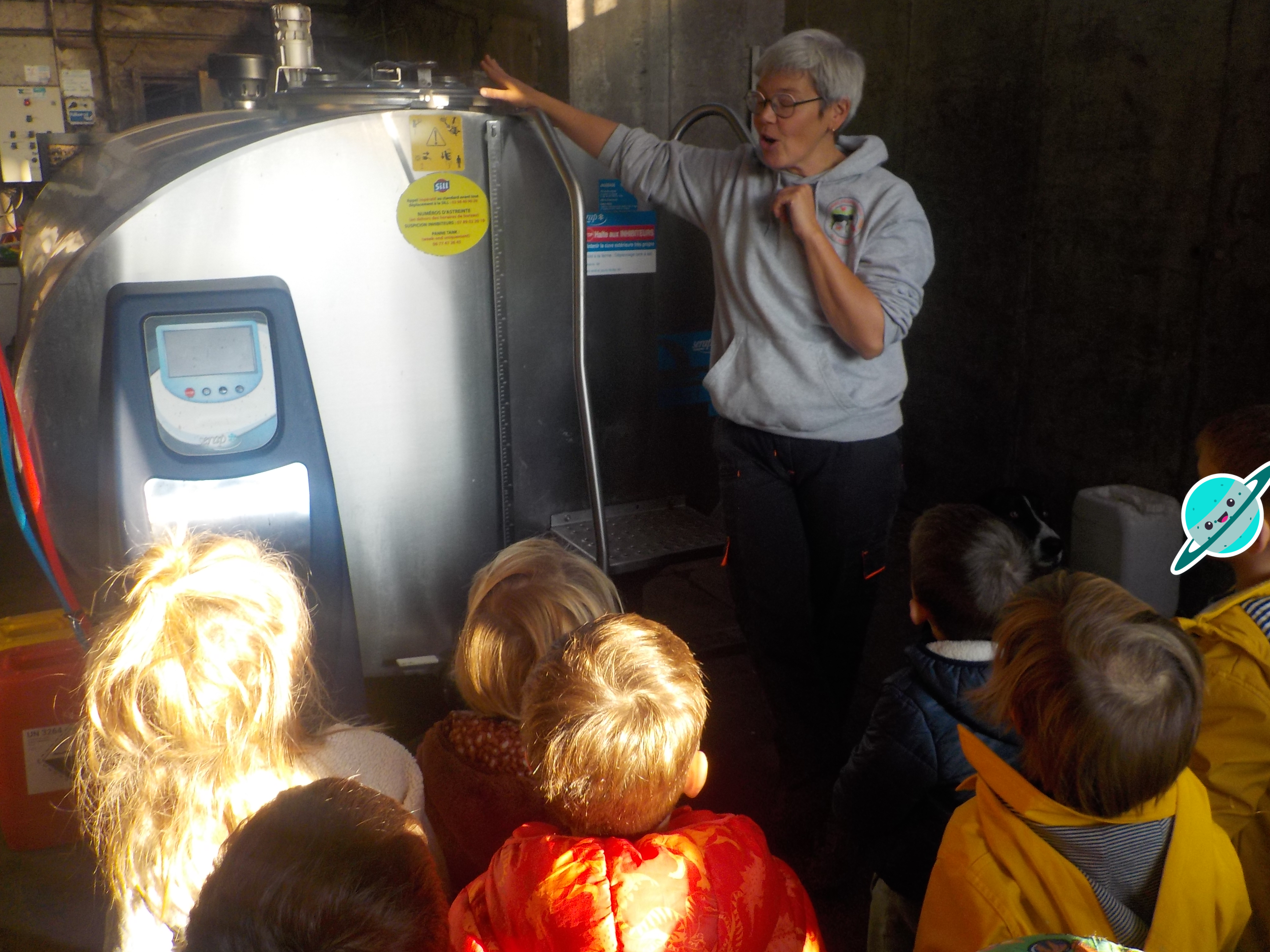 Béatrice a expliqué que le lait des vaches était stocké dans cette grande cuve.; « C’est beaucoup quatre mille litres, » « Avec le lait, des yaourts et du beurre bios sont préparés; »