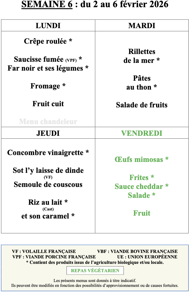 Menu du 2 au 6 fĂ©vrier đŸ„ž