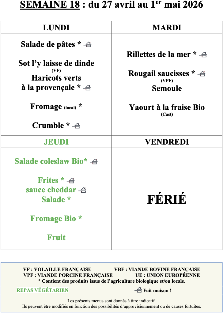 Menu du 27 avril au 1er mai